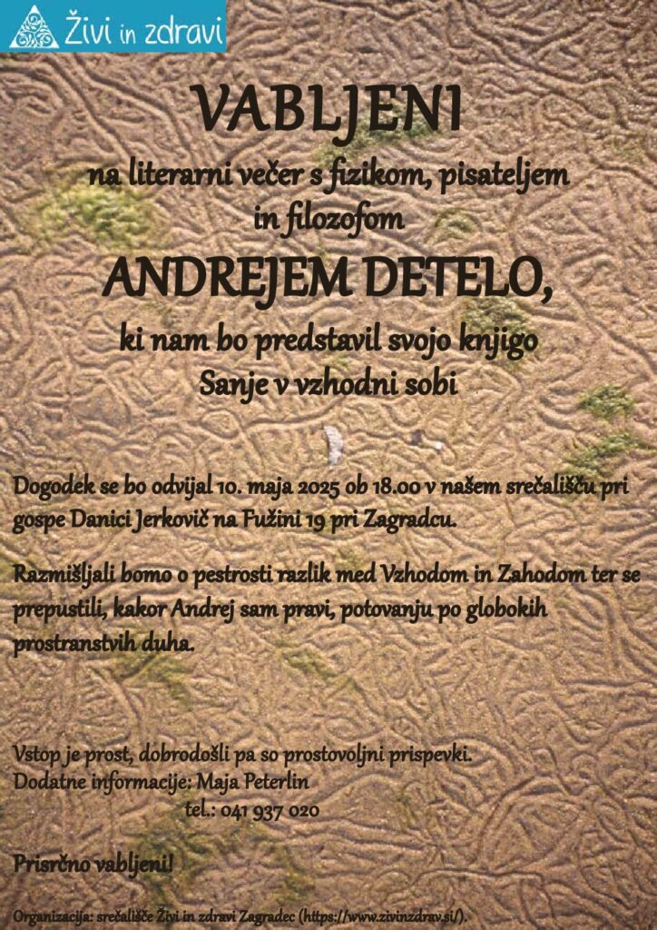 Fizik, pisatelj in filozof Andrej detela bo predstavil svojo knjigo Sanje v vzhodni sobi.